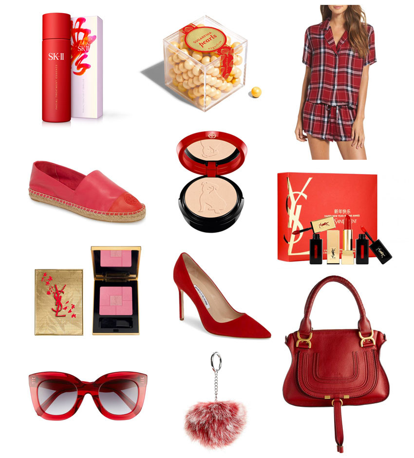SK-II Lunar New Year Facial Treatment Essence / Chinese New Year Gold Sugarfina Pearls / Rails plaid pajamas / Tory Burch colorblock espadrille flats / Armani Chinese New Year Highlighting Palette / YSL Lunar New Year Lip Trio / YSL Chinese New Year Hope & Joy Palette / Manolo Blahnik ‘BB’ Pump (hint Damon hint) / Chloe Marcie Small Bag / Red fluffy key ring / Celine Cat Eye Sunglasses